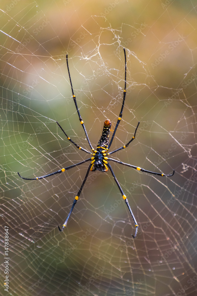 Black and yellow poisonous tropical spider in jungle