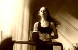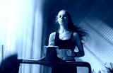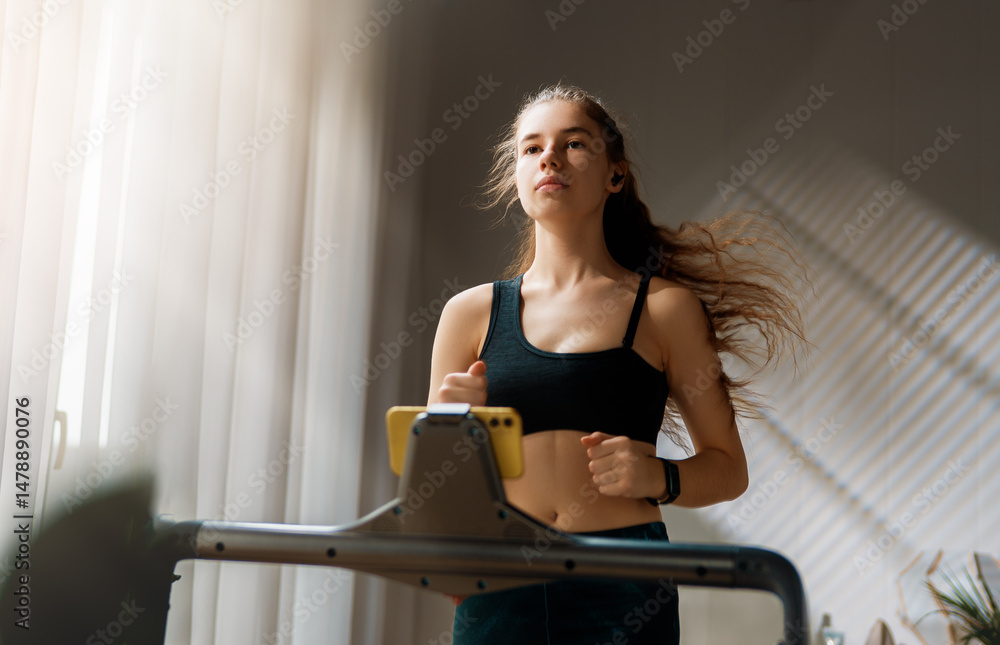Young woman running on a treadmill indoors