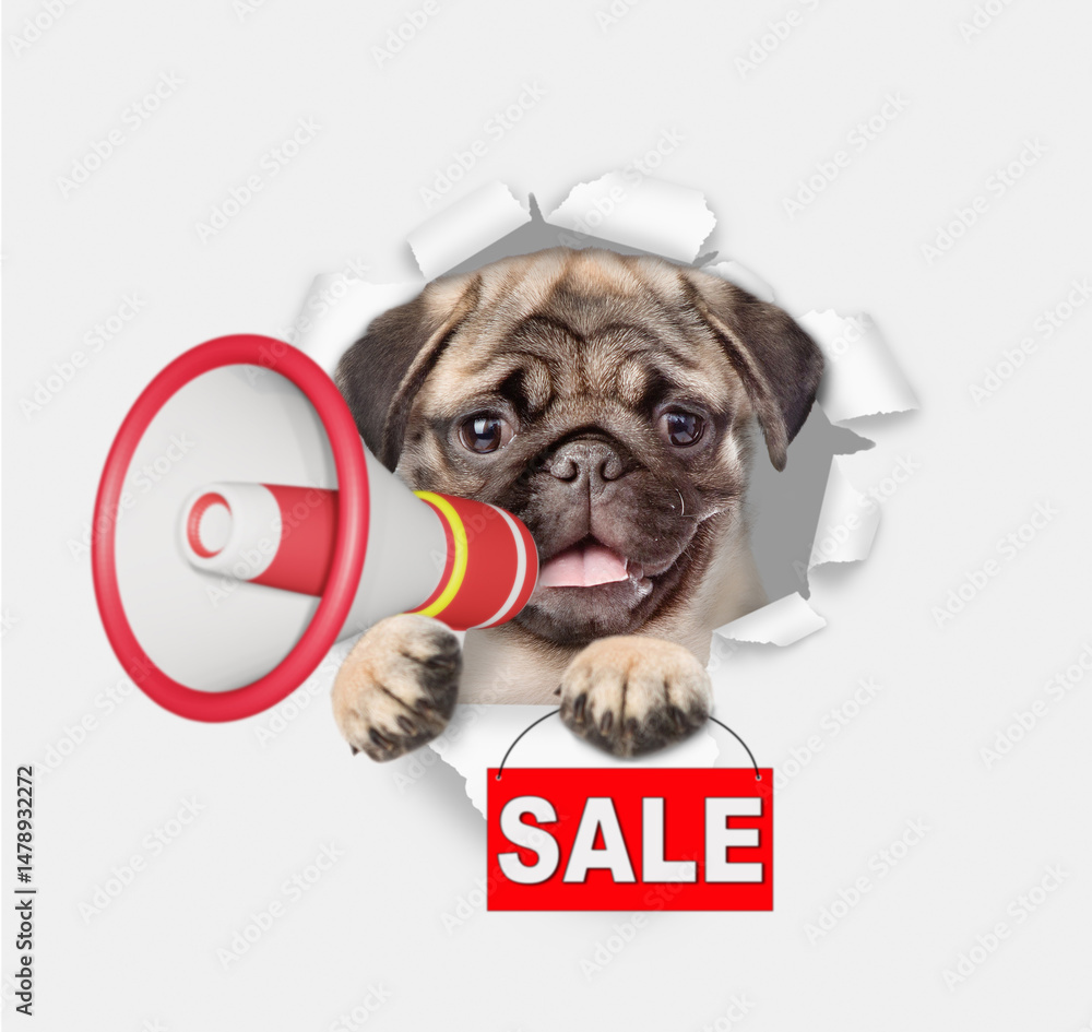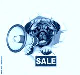 Funny Pug puppy looks through a hole in white paper and barking into a megaphone and showing signboard with labeled "sale"