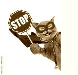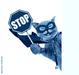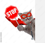 Happy Cat wearing like a doctor with superhero cape and with stethoscope on his neck looks from behind white banner and shows stop sign. Isolated on white background