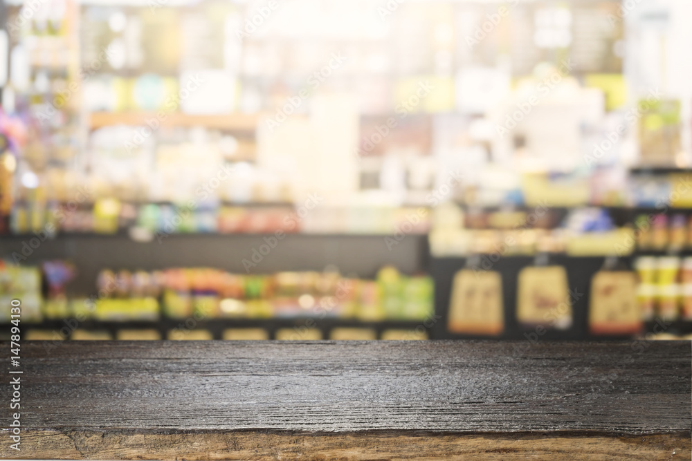 Empty wooden table space platform and blurred bakery shop or coffee cafe background for product display montage.