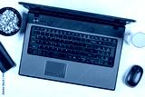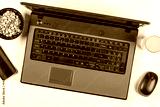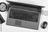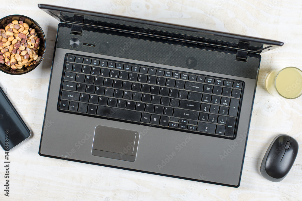 Business lap top flat lay with peanuts juice and mobile phone