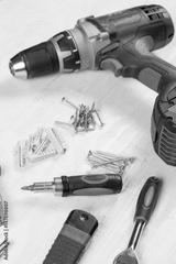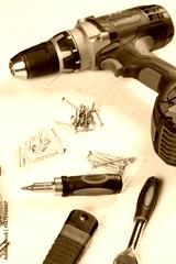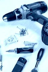 Acu drill screwdriver rachet and tools flat lay over wooden background