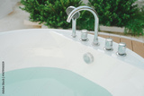 Close-Up Beautiful white bathtub with fern in spa, tree decoration for relax