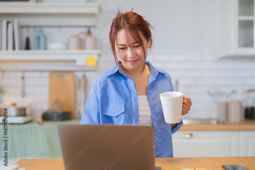 Young woman looking at laptop in kitchen young Asian woman snacking on healthy rice crisps while working from home with laptop working in kitchen with notebook