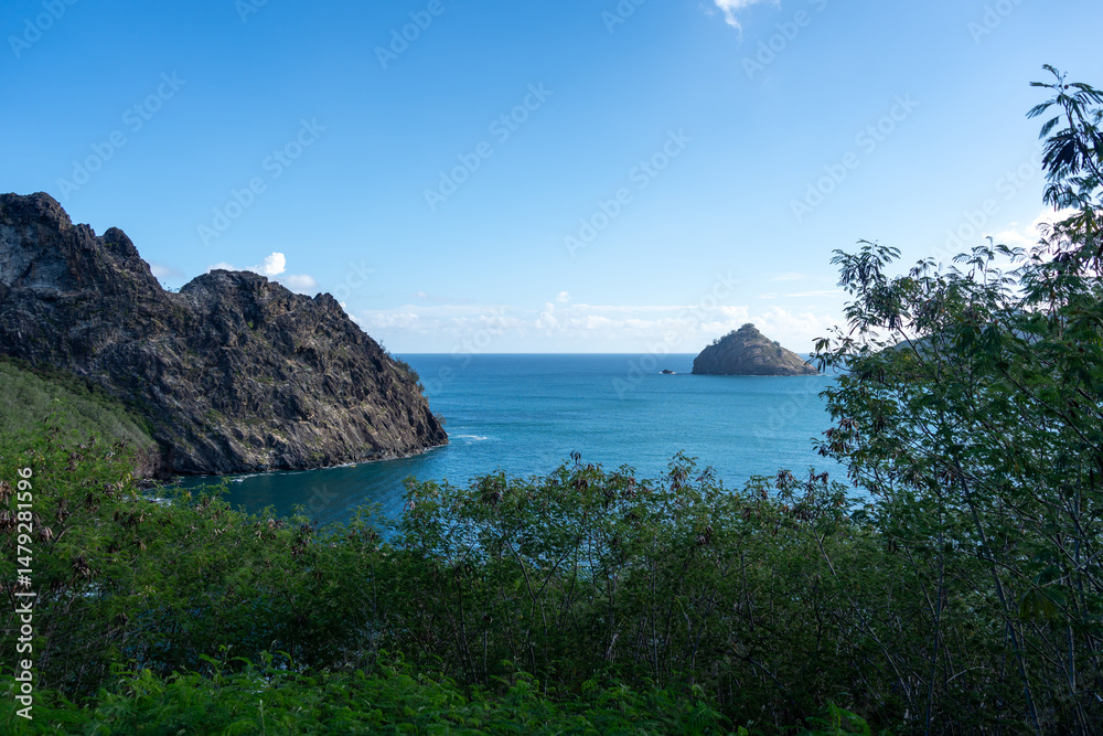 Cliffs and coastline of Taiohae Bay in Nuku Hiva, Marquesas Islands, French Polynesia