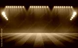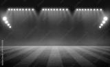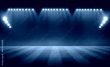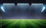 Empty soccer stadium at night. Bright stadium lights illuminate green field. No people are visible in stands. Focus is on vibrant green grass.
