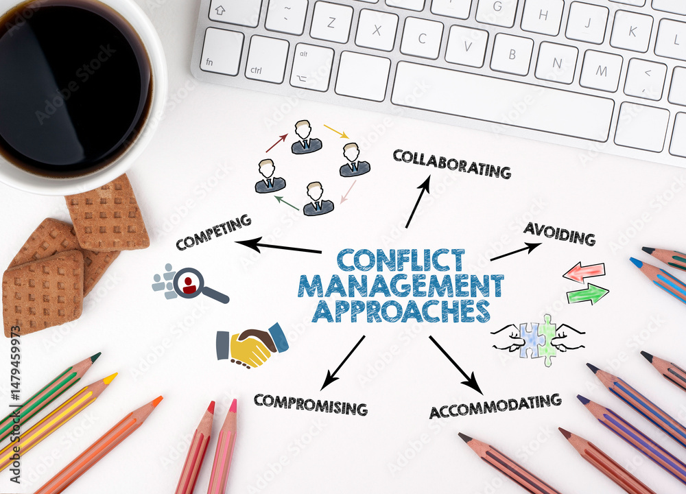 CONFLICT MANAGEMENT APPROACHES Concept. Chart with keywords and icons. White office desk