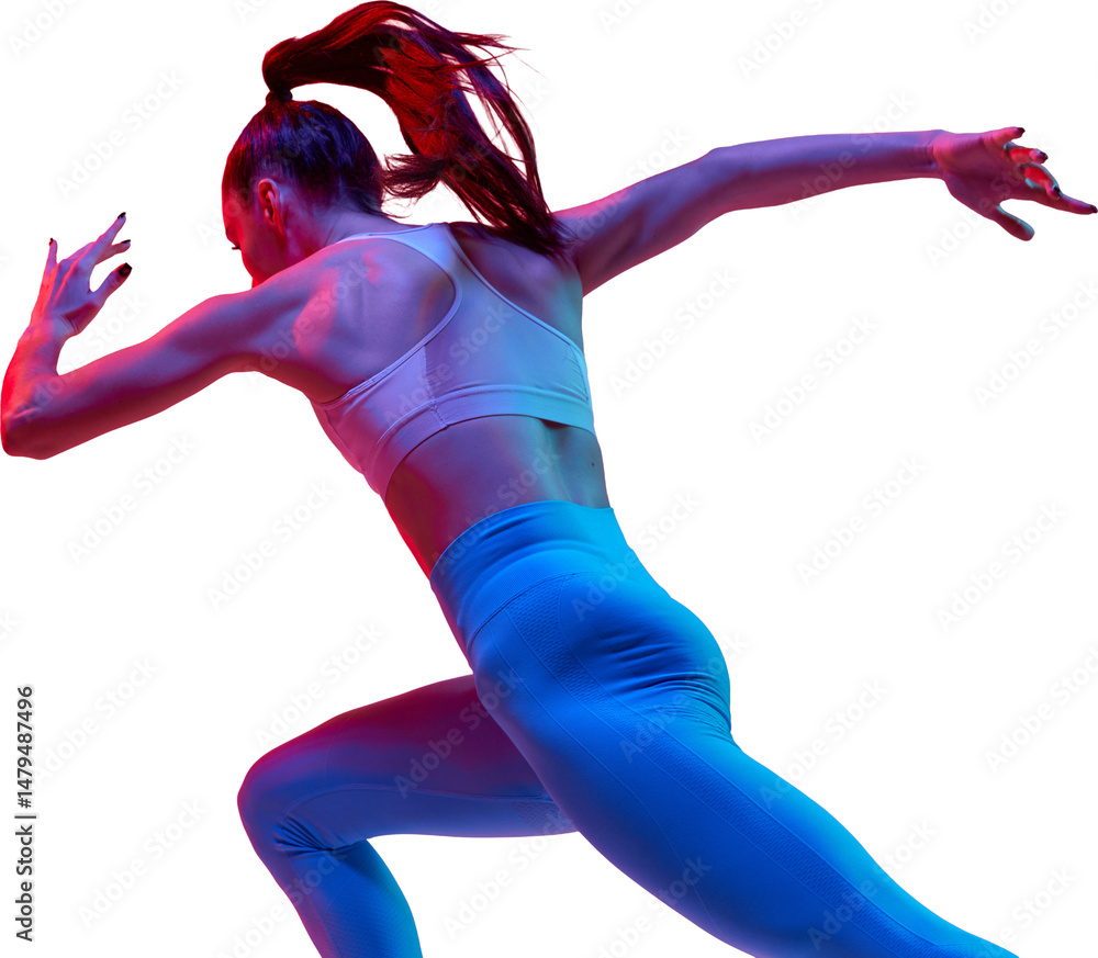 Back view of sportive woman, professional athlete, runner in motion, training isolated on transparent background in neon light. Concept of sportive lifestyle, health, endurance, action and motion. Ad