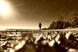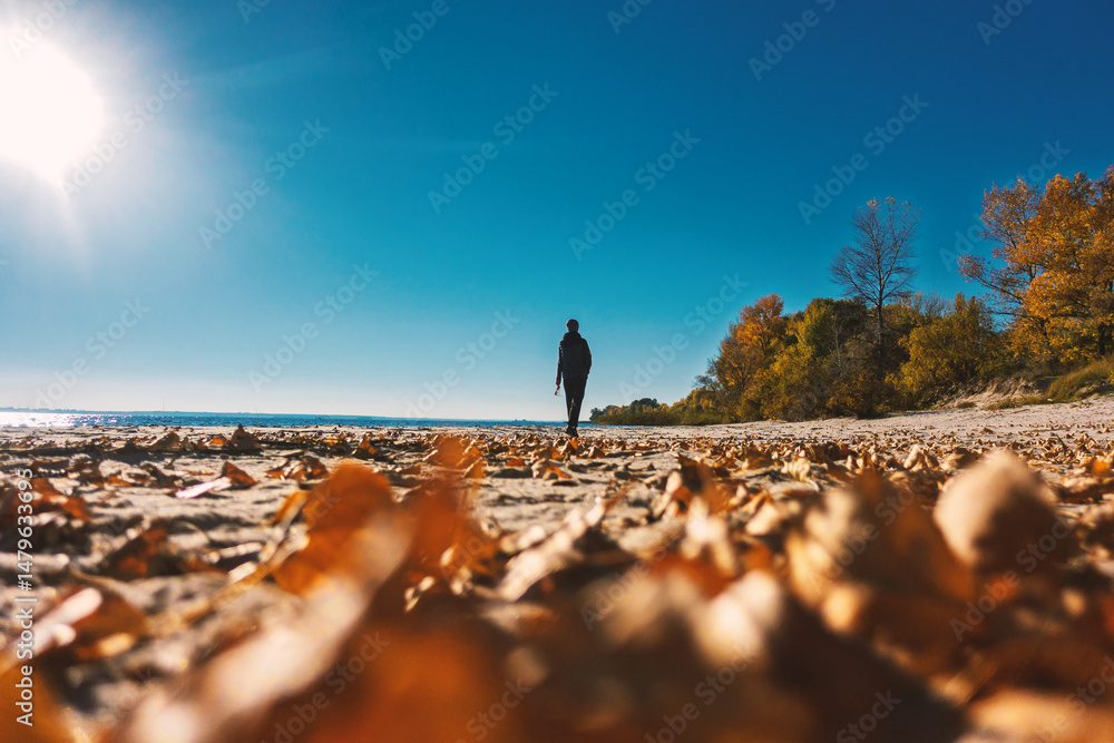 A Solitary Figure Walking on a Beach Under a Brilliant Sky Surrounded by Autumn Leaves