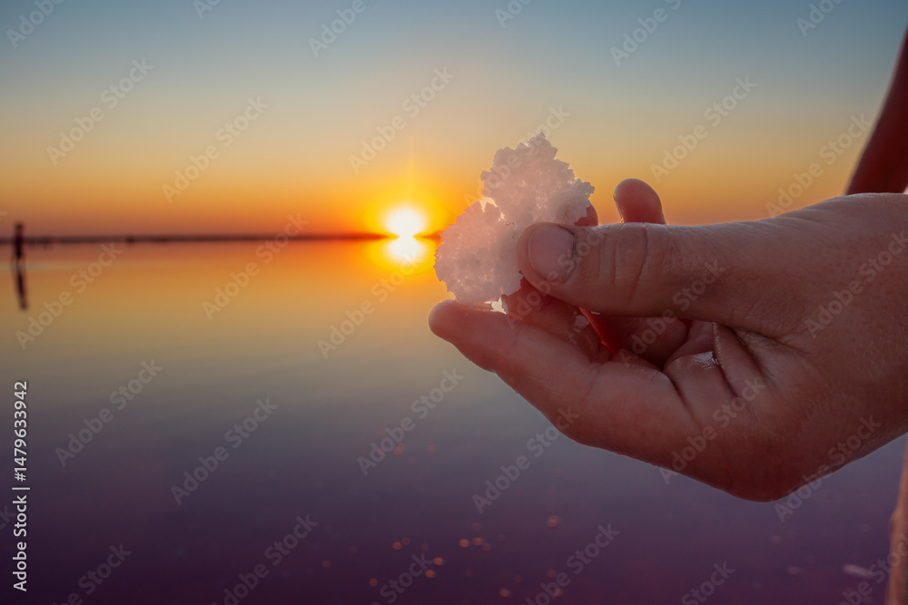 Holding a Salt Crystal in Hand Against the Backdrop of a Pink Lake and the Sunset Sky