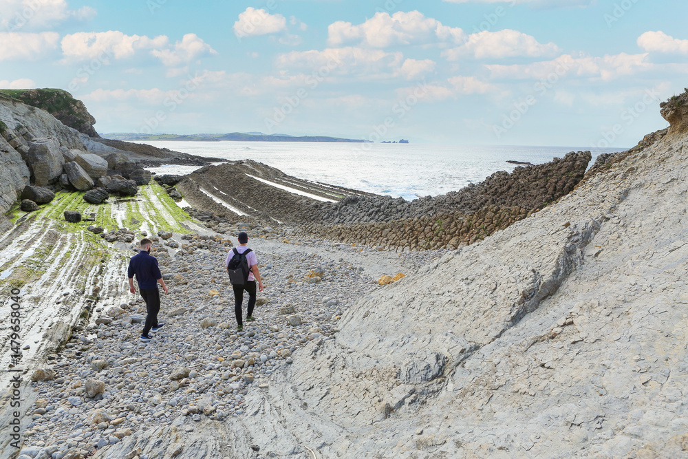 Two people walking through the landscape of the Costa Quebrada in Cantabria