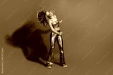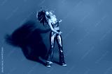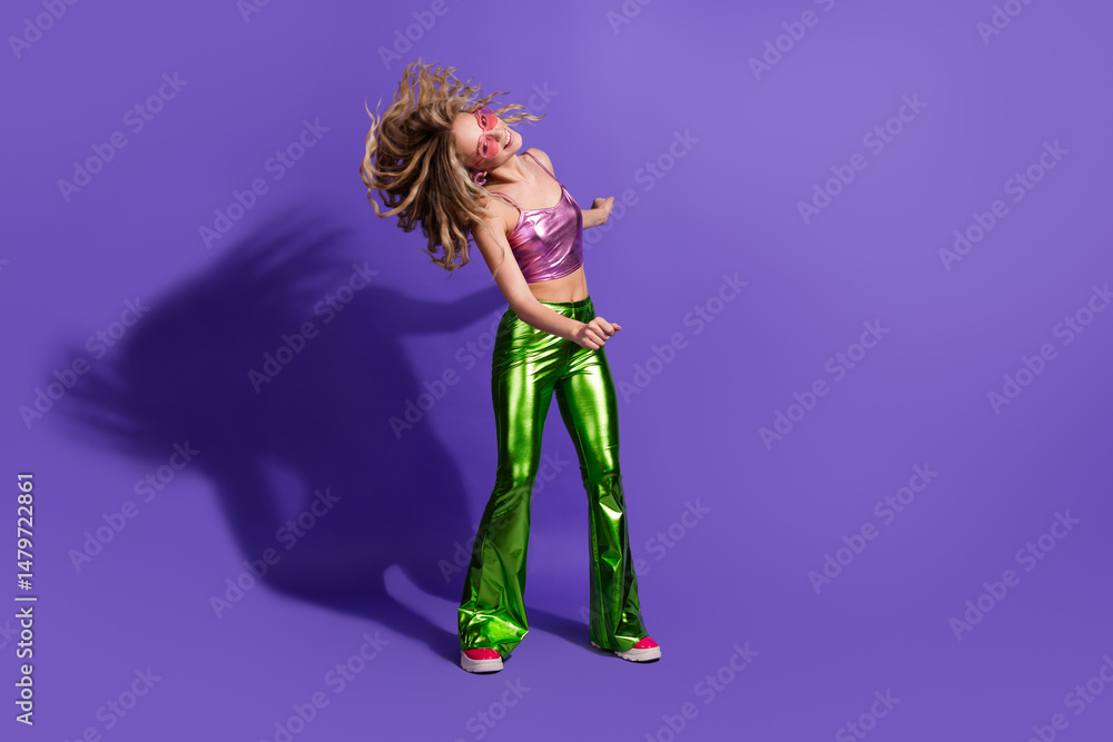 Young woman in stylish retro fashion dancing against vibrant purple background