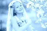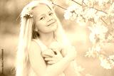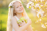Pretty little girl in blooming apple tree garden
