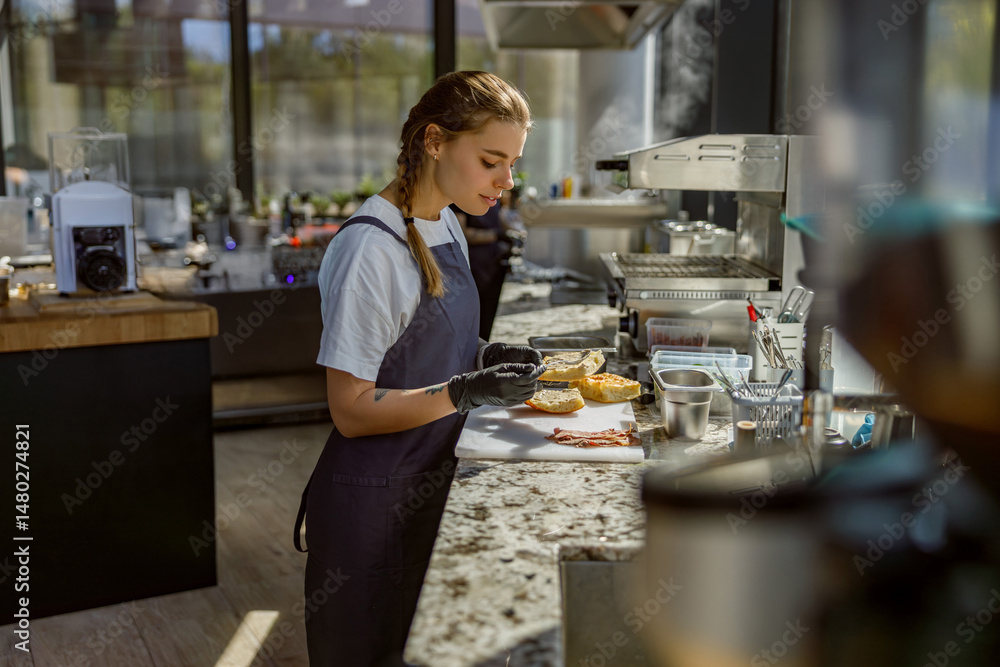 A highly focused and talented chef is skillfully plating an exquisite gourmet dish in a modern contemporary kitchen