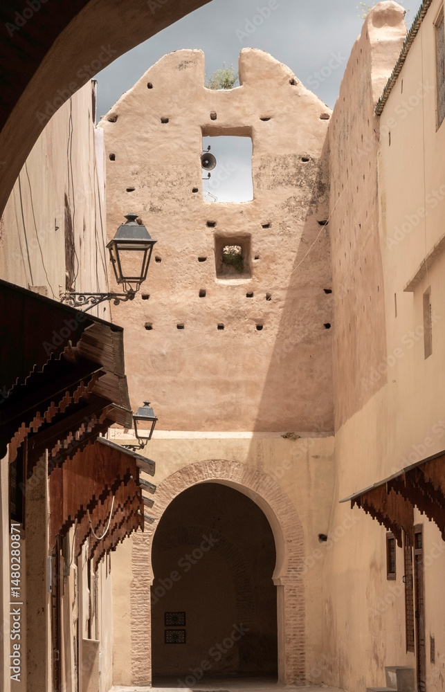 Elegant Moroccan arches and ornate doors grace the vibrant Meknes medina showcasing intricate craftsmanship and a rich architectural heritage. A timeless fusion of tradition and beauty in every detail