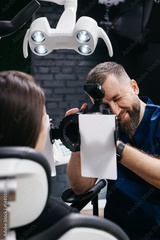 A dentist takes pictures of a client's teeth on a camera during an appointment at a dental clinic. Dental clinic. Concept of dental services and treatment.