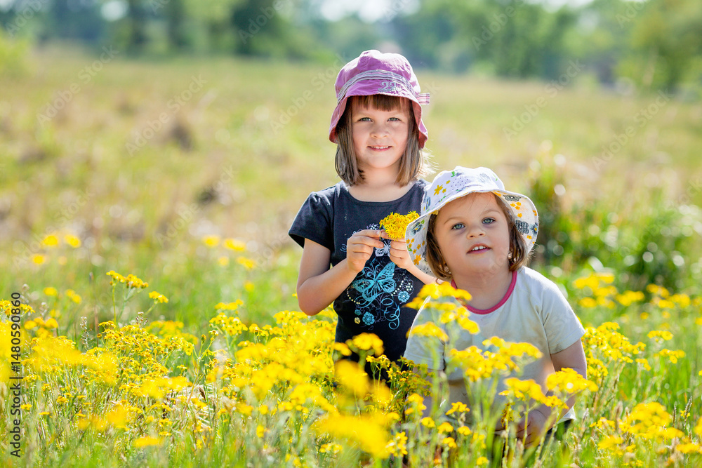 Two young children in sunhats picking yellow wildflowers in a sunny meadow, enjoying a carefree summer day outdoors in nature surrounded by green grass and blooming flowers
