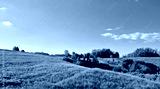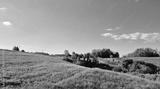 A serene, expansive view from Gornje Psarjevo looking east showcases rolling green meadows and scattered trees under a vast blue sky with wispy clouds