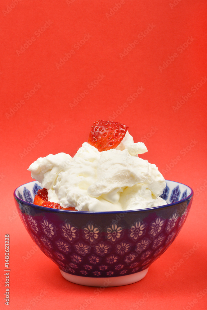 Side view of a blue and white patterned bowl holds fresh strawberries generously covered with white whipped cream against a vibrant red background