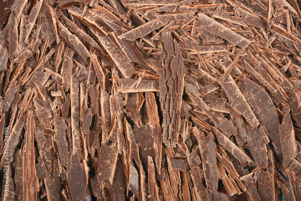 A close-up shows a pile of dark chocolate shavings with a rich, textured surface