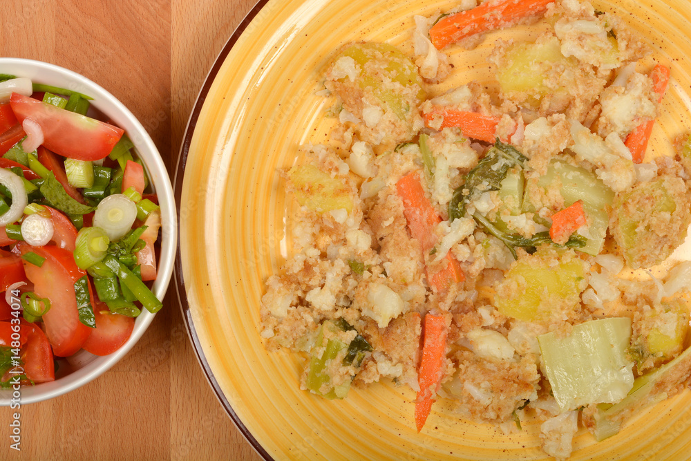 Cooked vegetables with saladA top-down view shows a yellow plate with cooked carrots, cauliflower, and potatoes with breadcrumbs, next to a bowl of tomato and green onion salad on a wooden surface