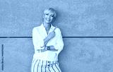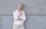 Presentation. Woman pointing to blank space - copy space, middle age woman presenting your product, against gray background - wall. Promoter shows space for your text