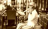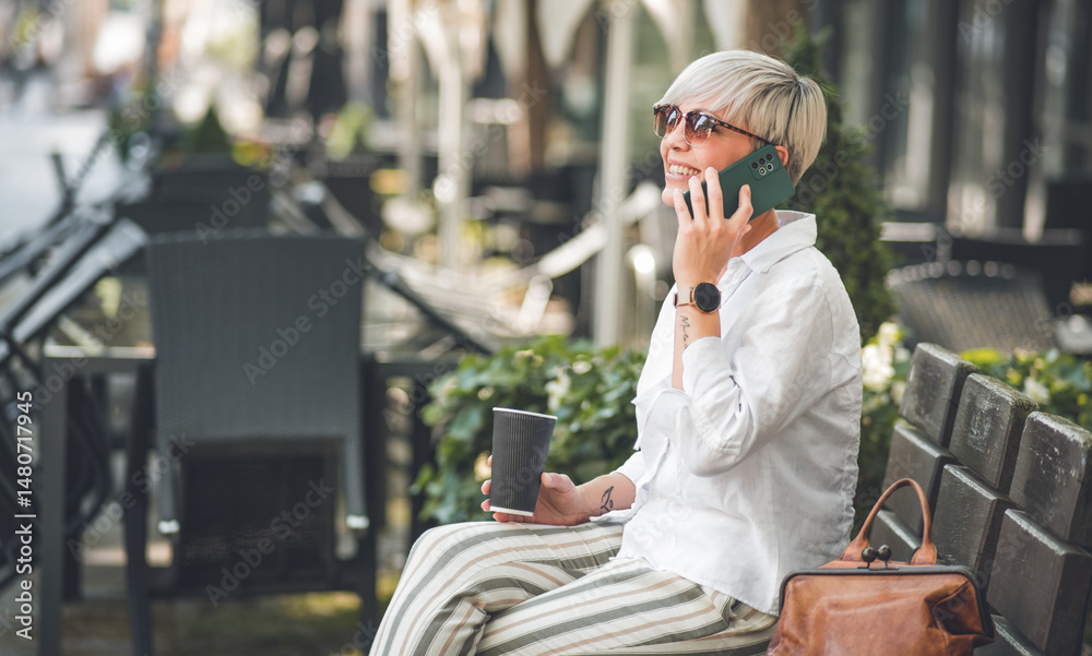 Woman on the mobile phone talking and resting on bench in the city, outdoors - outside. Profile or side view of adult female speaking on smartphone
