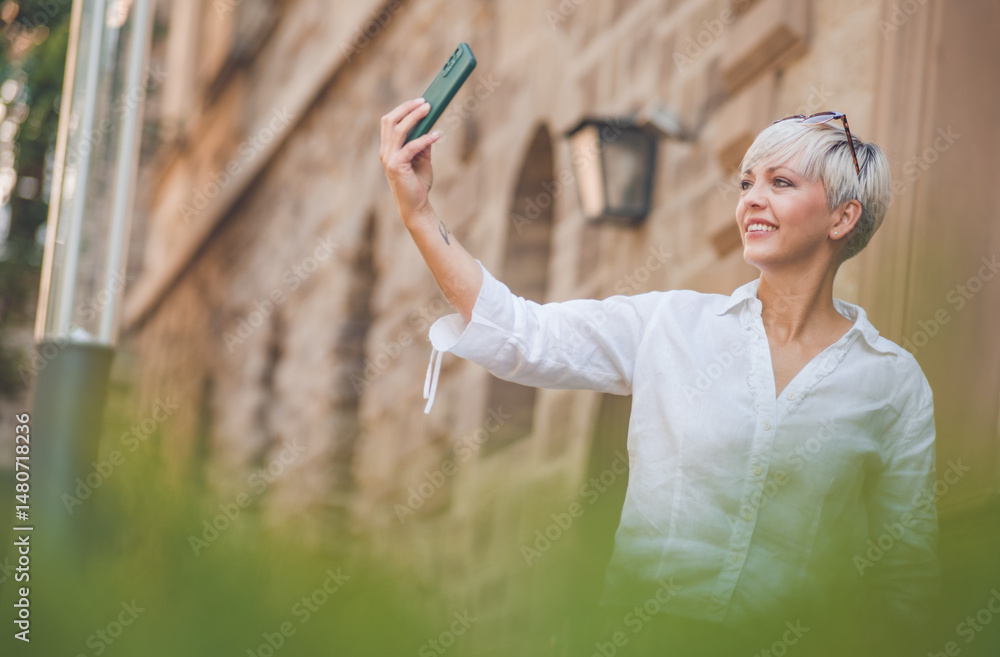 Trendy adult woman holding in hands smartphone and making selfie. adult woman using smart phone.