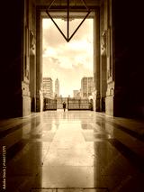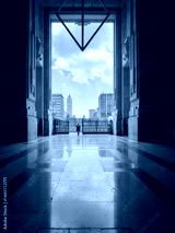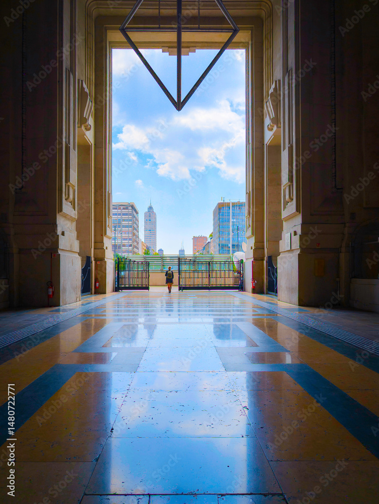 Modern elegant entrance gate of Milano Centrale railway station with reflections on the marble floor—where contemporary design meets historic grandeur in the heart of Lombardy, northern Italy.