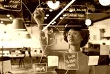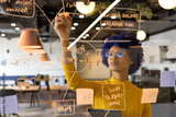 Young African American woman writing on glass board in open-plan office, with sticky notes, tablet