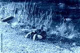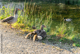 A greylag goose shelters her fluffy goslings by the river in soft spring light. A peaceful wildlife scene symbolizing family care, renewal, and connection with nature