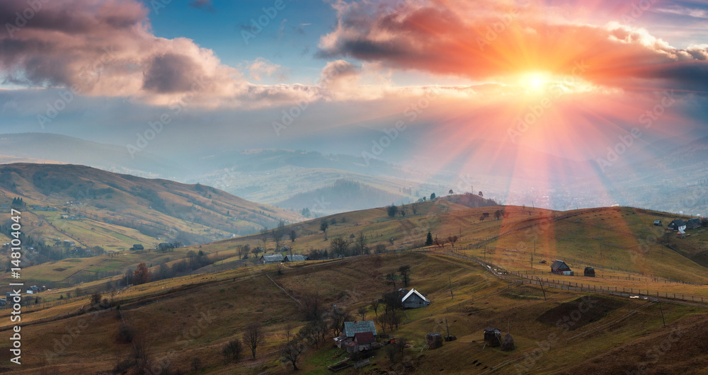 Panoramic landscape of the spring mountains at sunset. View of a hilly countryside.