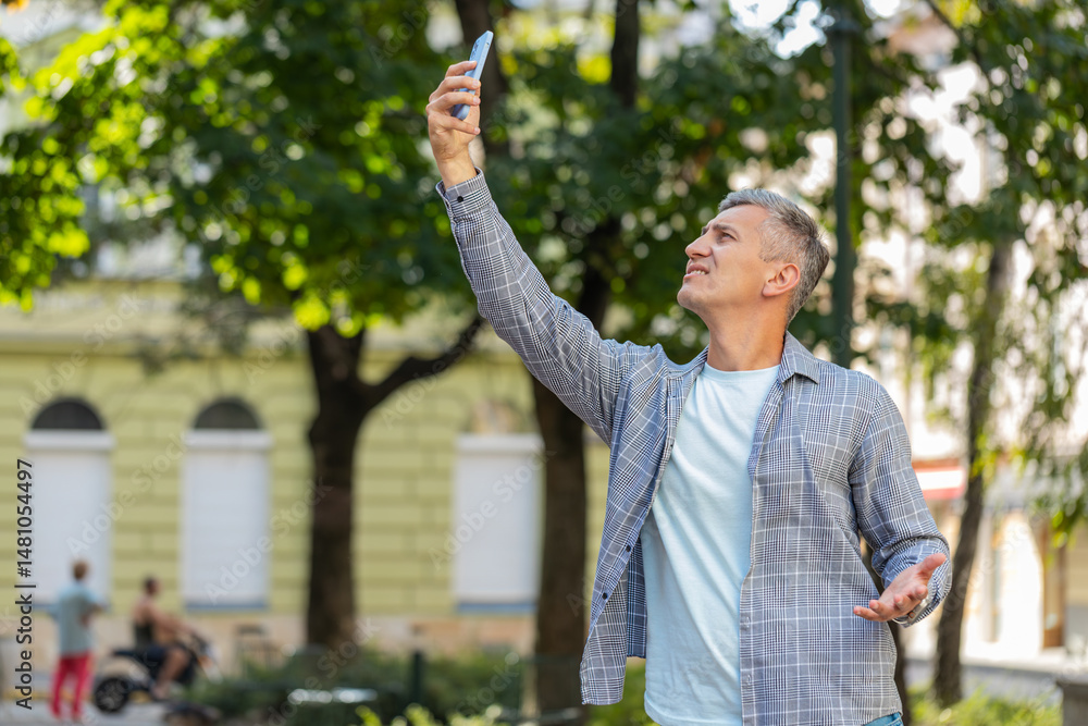Grey-haired mature man tourist trying to catch a communication signal and Internet on mobile phone raised phone up for a better connection in city street. Frustrated Caucasian middle-aged guy in town