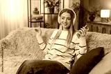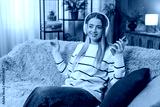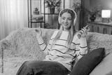 Caucasian happy young woman sitting on sofa at home, enjoying listening music with headphones, holding smartphone, closing eyes, smiling, feeling happy relaxed moving head to rhythm. Indoors lifestyle