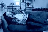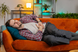 Caucasian young man lying on sofa feeling sudden strong abdominal stomach ache, gastritis problem. Upset sick guy having symptom poisoning diarrhea indigestion peptic ulcer pancreatitis at home room