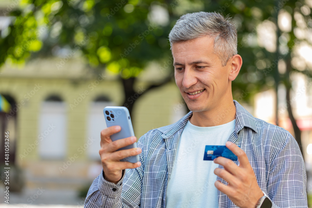 Smiling gray-haired man using credit card smartphone while transferring money, purchases online shopping, order food delivery, booking hotel room outdoors. Mature guy walking on urban city street.