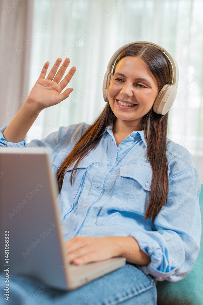 Happy young Caucasian woman in headphones making online webcam video call on laptop talking waving hand hello hi. Communication, meeting. Smiling girl making chat conversation lying on sofa at home