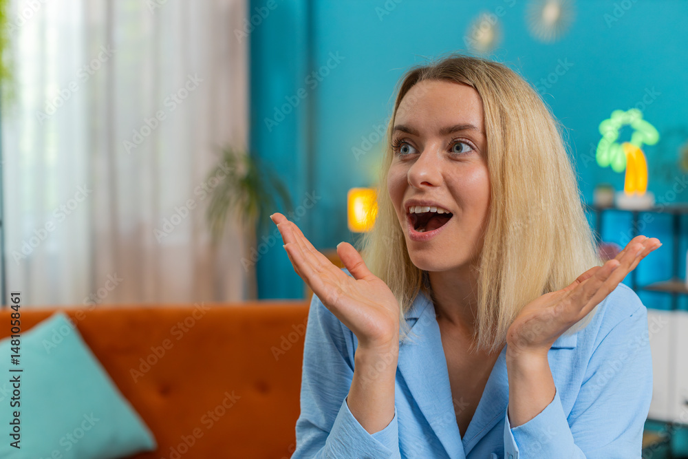 Oh my God, Wow. Blond young woman surprised looking at side with big eyes, shocked by sudden victory, good win news, celebrating at home. Excited happy amazed girl freelancer indoors in living room.