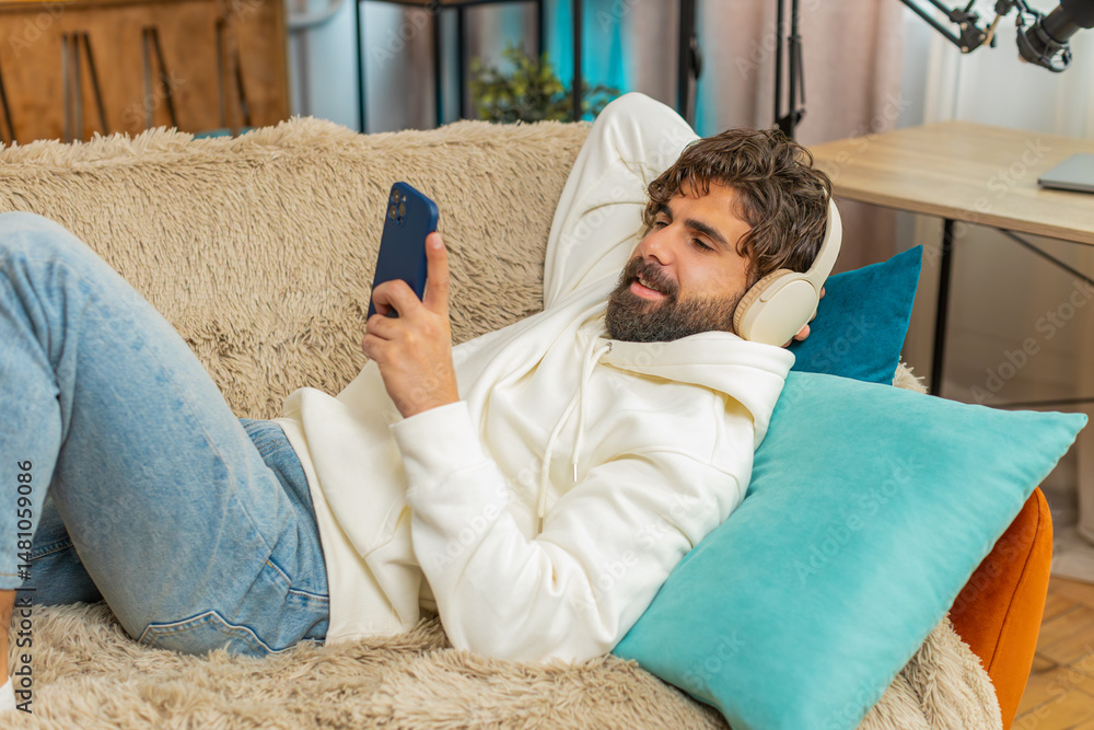 Happy overjoyed young man in wireless headphones with smartphone relaxing lying on sofa couch at home apartment choosing, listening favorite energetic disco dancing music. Weekend leisure activities.