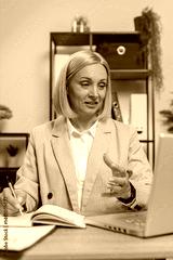 Mature attractive businesswoman writing down or taking down notes while attending online video class or office meeting on laptop at home office desk. Girl freelancer support services looking at webcam