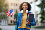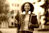 Study Abroad. Smiling Black Female Student Posing With American Flag Outdoors, Happy Young African American Woman With Backpack And Workbooks Standing Near University Building, Copy Space