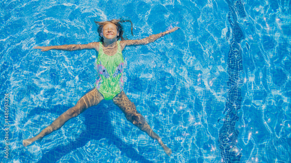 Young girl enjoys a joyful moment while floating in a bright blue swimming pool on a sunny day