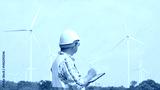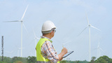 Engineer working with laptop at wind turbine field generating electricity for renewable clean energy