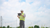 Engineer working with laptop at wind turbine field generating electricity for renewable clean energy