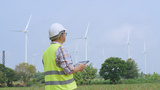 Engineer working with laptop at wind turbine field generating electricity for renewable clean energy