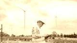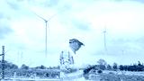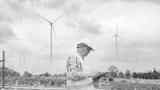 Engineer working with laptop at wind turbine field generating electricity for renewable clean energy