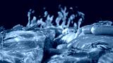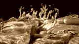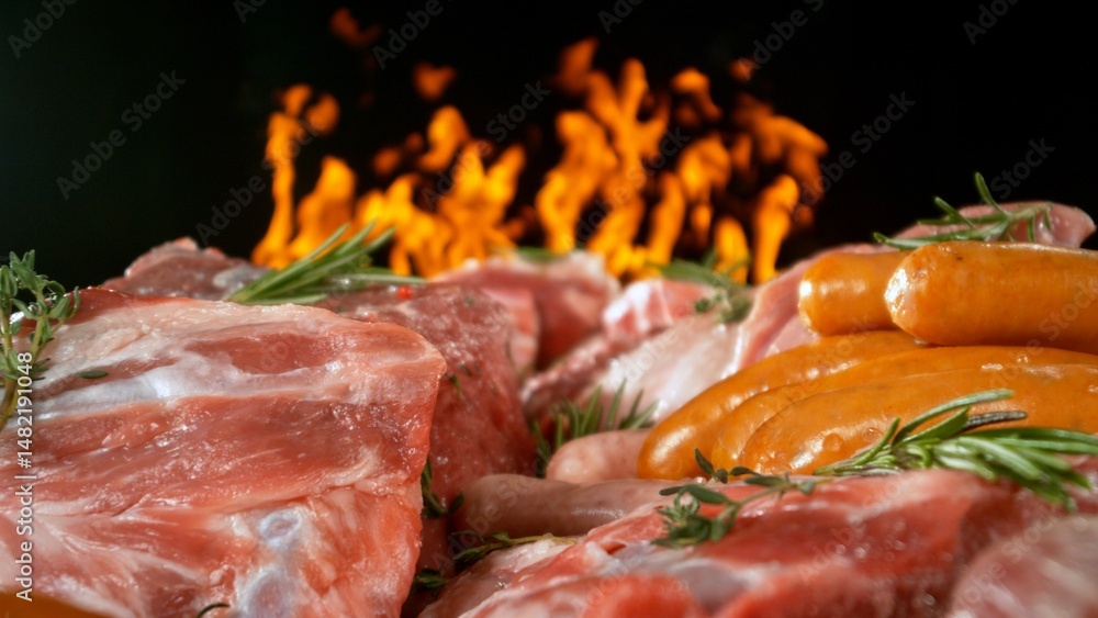Large assortment of premium raw meat, beef, sausages, pork and chicken suitable for butchery advertising, fire on background