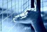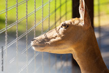A deer and fawns behind a fence in a landscape zoo on a summer day.
