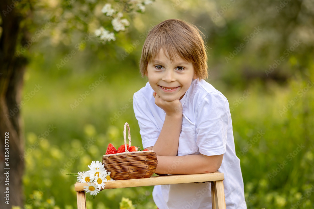 Beautiful blond child, boy, eating strawberries and gathering flowers